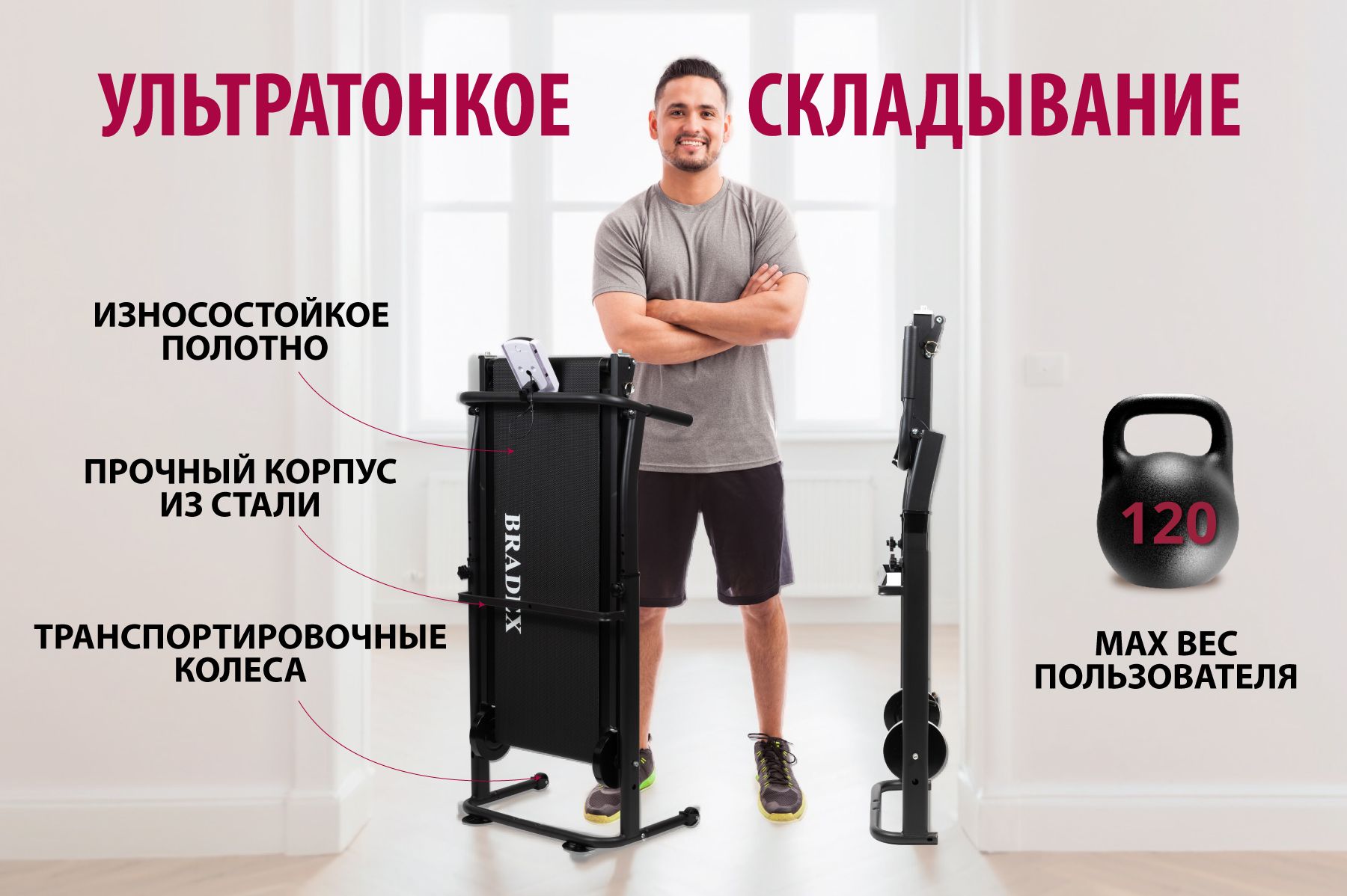 Складная конструкция дорожки позволит сэкономить место в комнате после тренировки.