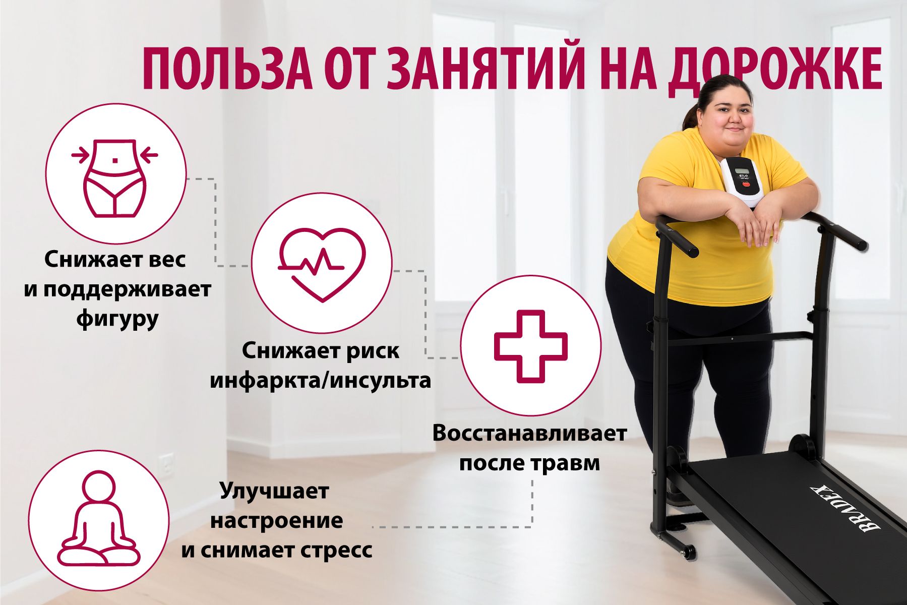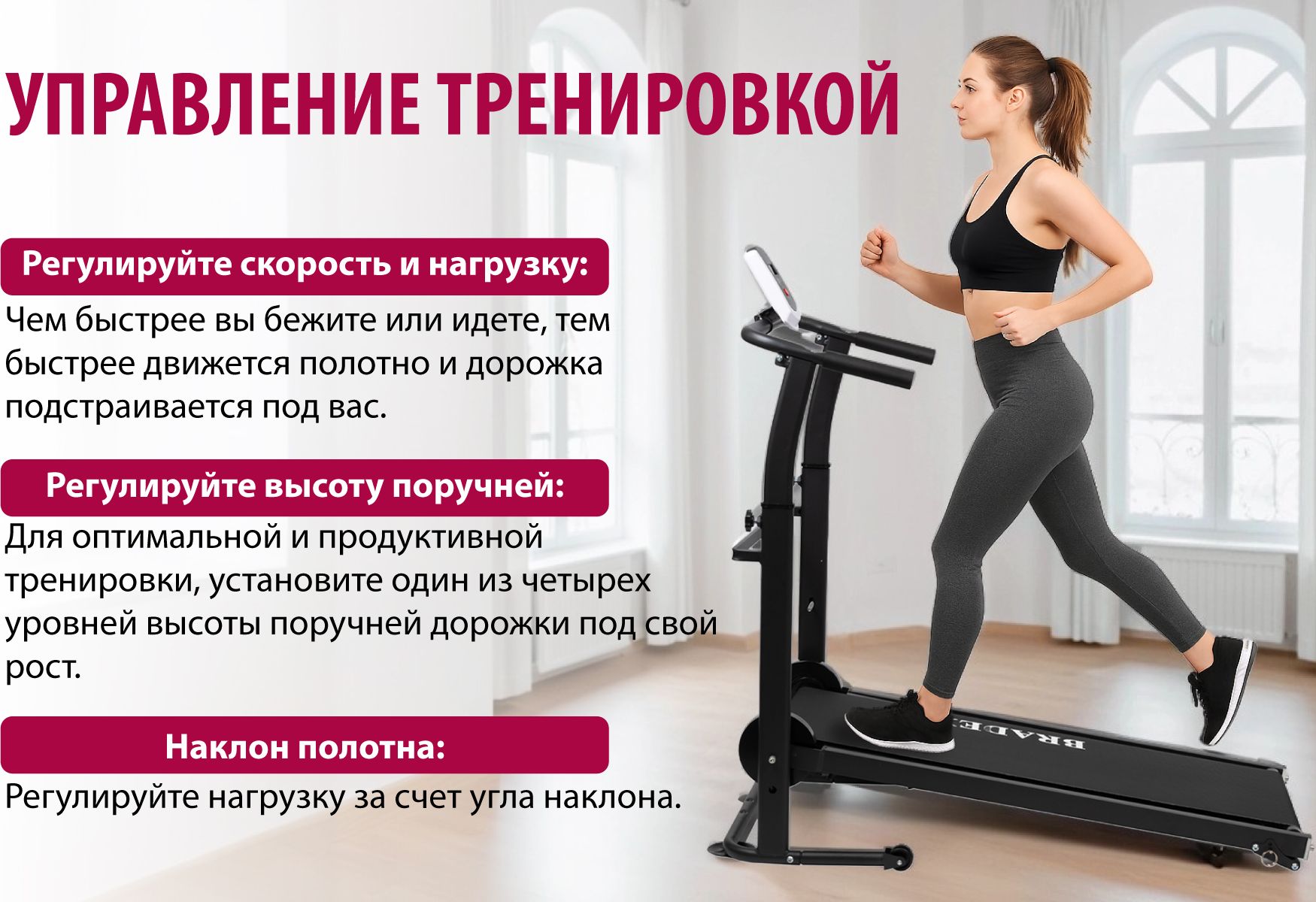 Для оптимальной и продуктивной тренировки беговая дорожка имеет 4 уровня регулировки высоты поручней, которая позволит настроить тренажер под ваш рост.