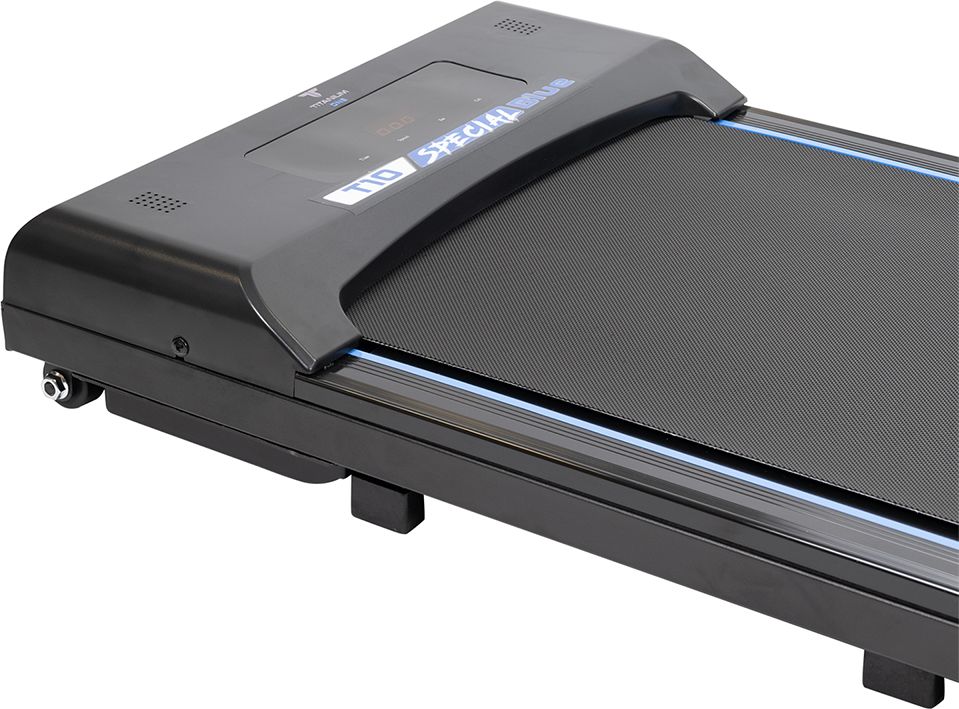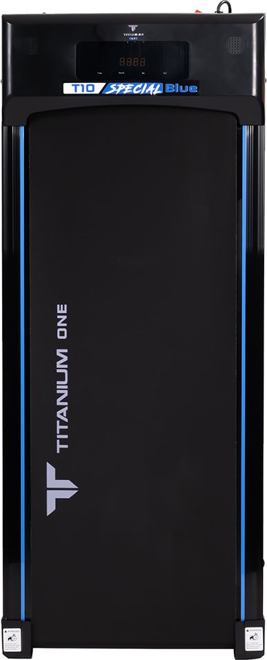 Titanium One Т10 Special blue требует минимум места для использования и хранения. В рабочем состоянии размер тренажера составляет 122 см. в длину и 49 см. в ширину – даже в самой малогабаритной квартире легко найдется место для тренировки. В сложенном виде толщина беговой дорожки составляет всего 13 см., ее можно положить под кровать или прислонить к стене в горизонтальном виде. Учитывая вес дорожки всего в 16,5 кг. и наличие транспортировочных роликов, переместить тренажер не составит труда даже хрупкой девушке.
