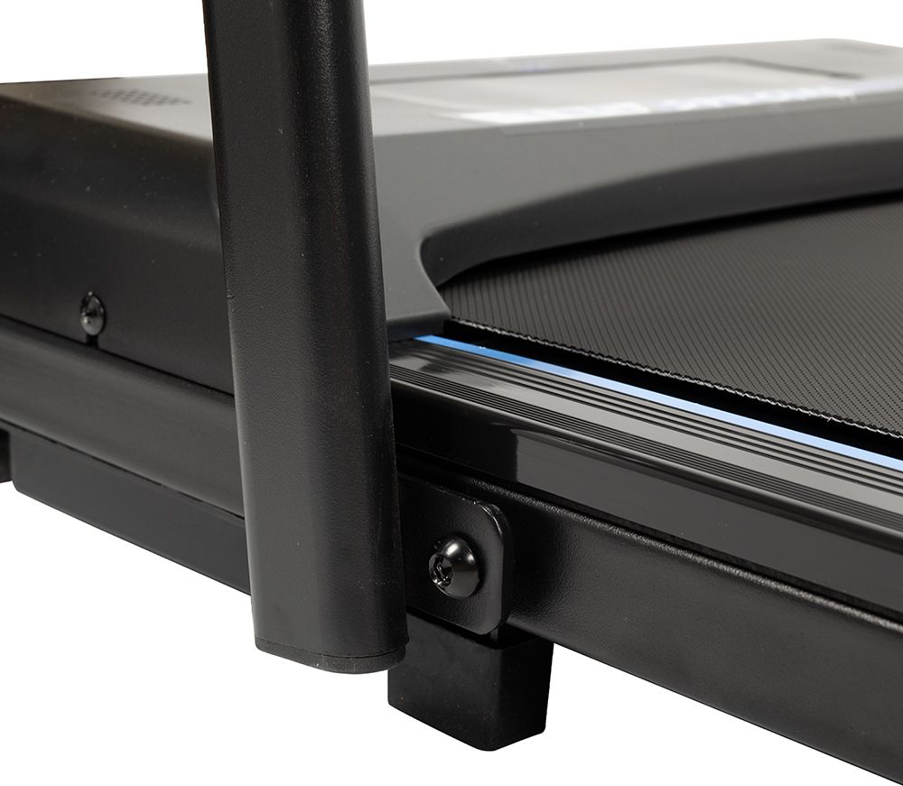 Titanium One Т20 Special blue требует минимум места для использования и хранения. В рабочем состоянии размер тренажера составляет 122 см. в длину и 55 см. в ширину – даже в самой малогабаритной квартире легко найдется место для тренировки. В сложенном виде толщина беговой дорожки составляет всего 13 см., ее можно положить под кровать или прислонить к стене в горизонтальном виде. Стойки консоли крепятся на 2-ух винтах, процесс сборки и разборки займет около минуты (для сложения поручня необходимо открутить только 2 винта из 4). Учитывая вес дорожки всего в 18,8 кг. и наличие транспортировочных роликов, переместить тренажер не составит труда даже хрупкой девушке. Тренироваться на беговой дорожке можно как с поручнями, так и без. Поручни помогают не только удерживать равновесие - они также оборудованы держателем для мобильных устройств, куда можно установить смартфон или планшет. Это приятная опция - сериал или музыка отлично помогают справиться с рутиной и однообразием тренировок.